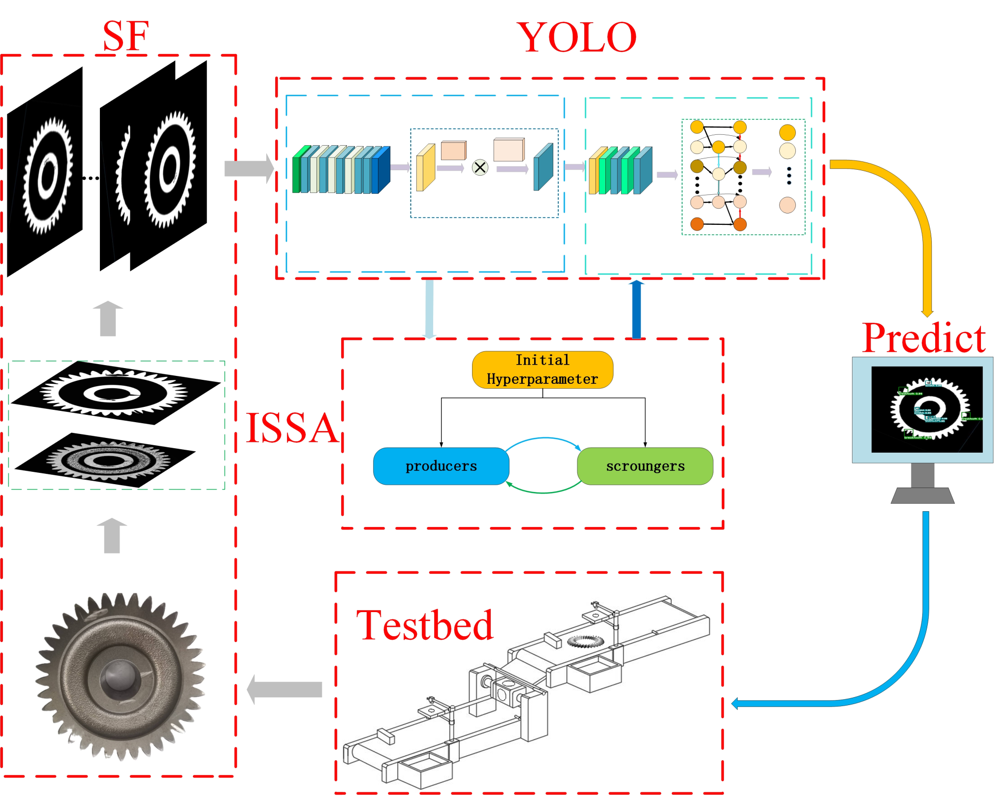该论文提出了一种基于进化优化的SF-YOLO模型,主要用于解决金属齿轮端面结构的不均匀和多尺度、小尺寸缺陷检测问题。该论文主要包括四部分,利用SF算法对数据做前处理,利用卷积神经网络训练预测模型,通过ISSA进化算法优化模型参数,最后由YOLO模型进行实时检测。实验表明,SF-YOLO 模型在金属齿轮端面缺陷测试集上的平均准确率达到了98.01%,F1值为0.99,每幅图像的平均检测计算时间为0.025s。与其他深度学习模型相比,本文所提出的SF-YOLO模型提高了金属齿轮端面缺陷检测的准确性和效率,可以高效检测小尺寸和多尺度齿轮端面缺陷,满足企业实时在线检测的需求。