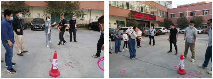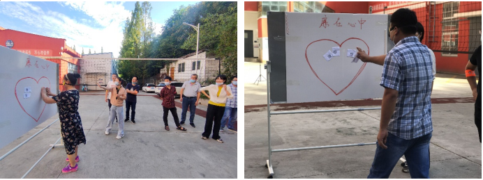 “廉”在心中项目,老师们头戴眼罩,手持“廉”字,在出发线转五圈后将“廉”字贴在红心中。展现怀有廉洁之心,塑造以清为美,以廉为荣的价值取向。