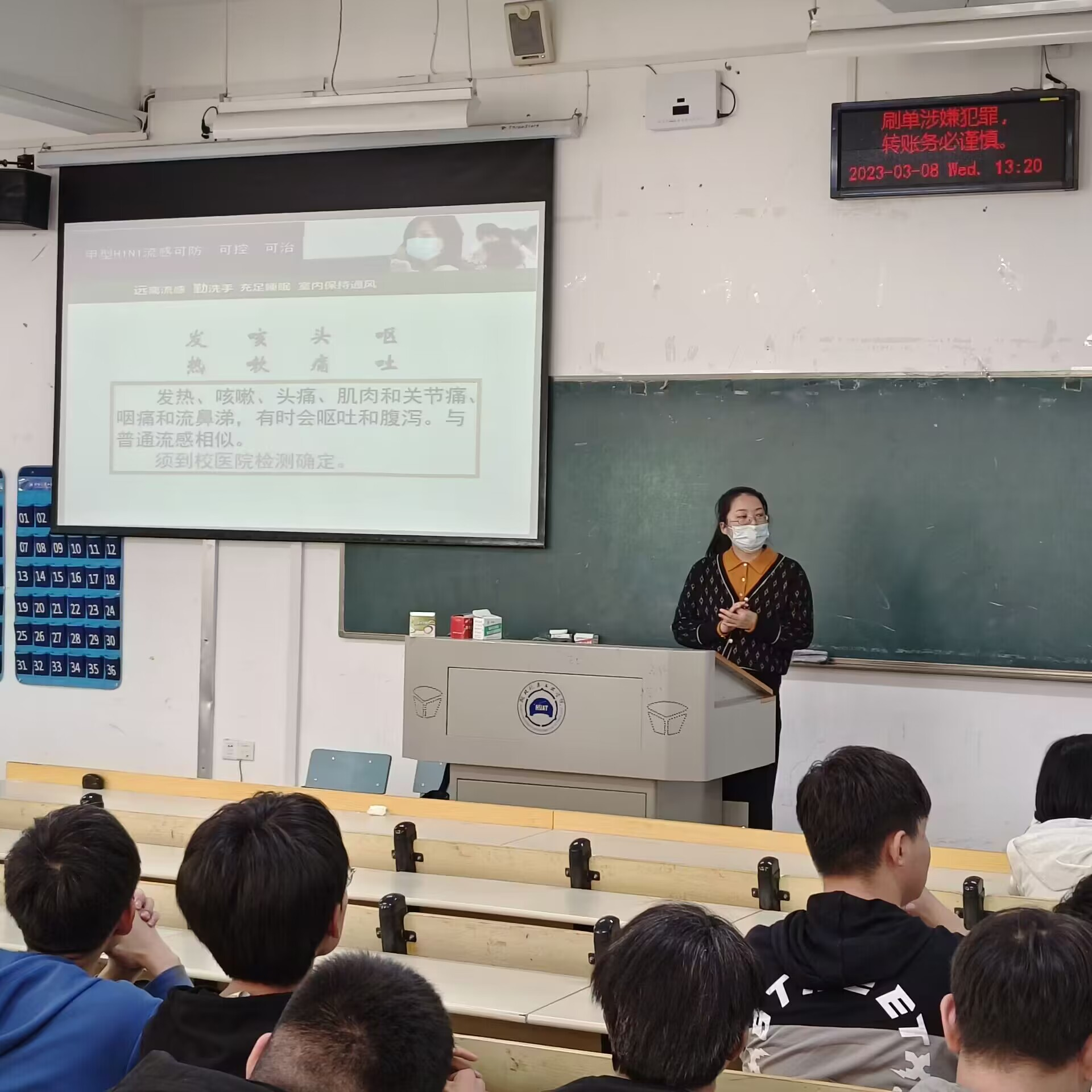 班会上,班主任主要对当前甲流形势,提醒同学们上课或者进入公共场所戴好口罩,注意勤洗手,宿舍卫生及通风,适当运动,保证休息,减少外出公司频次,出现发热等症状第一张时间告知班主任和辅导员;就流行性感冒与手足口病等重要的呼吸道传染病,重点从传播途径、主要症状、易感人群、预防措施四个方面介绍,让员工知道春季呼吸道传染病的发病特点,掌握呼吸道传染病的预防方法。