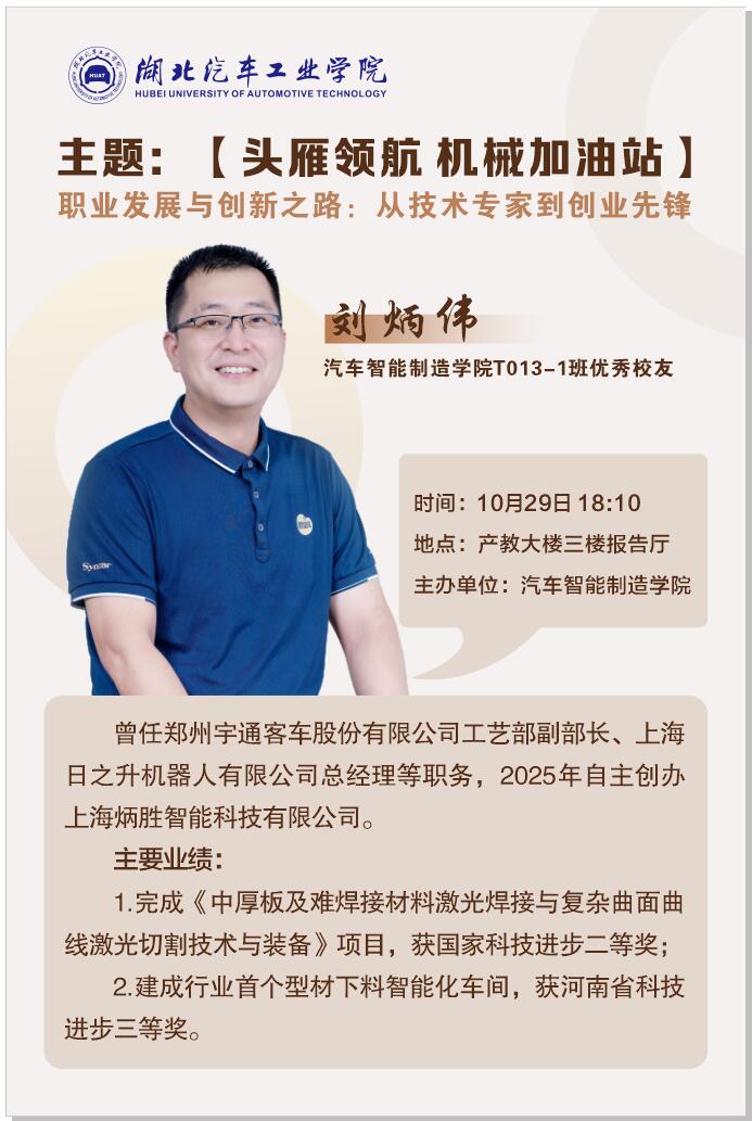 个人简介:刘炳伟,曾任郑州宇通客车股份有限公司工艺部副部长、上海日之升机器人有限公司总经理等职务,2025年自主创办上海炳胜智能科技有限公司。