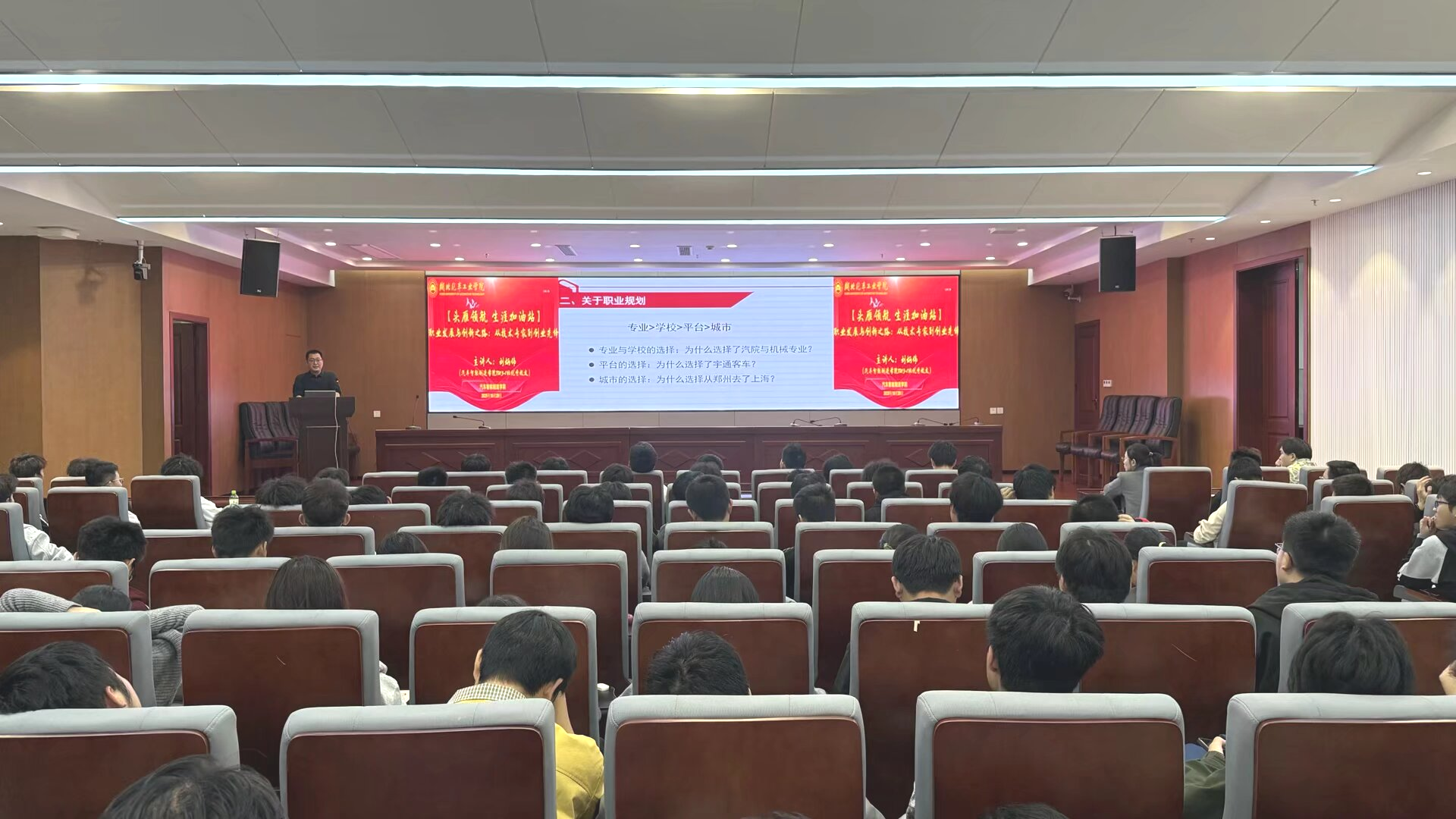 讲座现场,刘炳伟以“职业发展与创新之路:从技术专家到创业先锋 ”为题分享行业前沿与创业心得,他结合自身在宇通客车股份有限公司深耕十七载,从半成品工艺师逐步成长为工艺部副部长的职业经历,拓展同学们对专业前景的认知边界,并重点介绍其带领团队斩获国家科技进步二等奖的突破性项目案例,鼓励同学们在未来的职业生涯中保持求知、坚定热爱、勇于创新。他强调技术突破来源于“寻找好平台、学到真东西、发现真问题、认识行业顶尖人才、持续深耕反复探究”。在互动环节,刘炳伟耐心解答,并分享了宝贵的实践经验。他特别指出,“在困难时刻,汽院艰苦奋斗、自强不息的精神总是激励着我”。他鼓励学弟学妹们要扎实学好专业知识,尽早培养主动探索与解决问题的能力,在热爱中找准方向,勇于拥抱技术变革,敢于挑战未知领域,将个人成长融入国家制造业升级的大潮中。