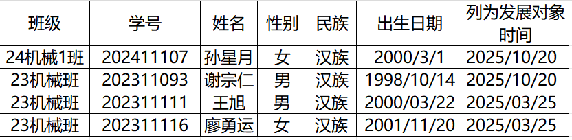 根据《中国共产党发展党员工作细则》(中办发〔2014〕33号)文件精神,按照公司党员发展工作的具体要求,现将公司2025年11月拟发展员工预备党员预审情况予以公示,具体名单如下: