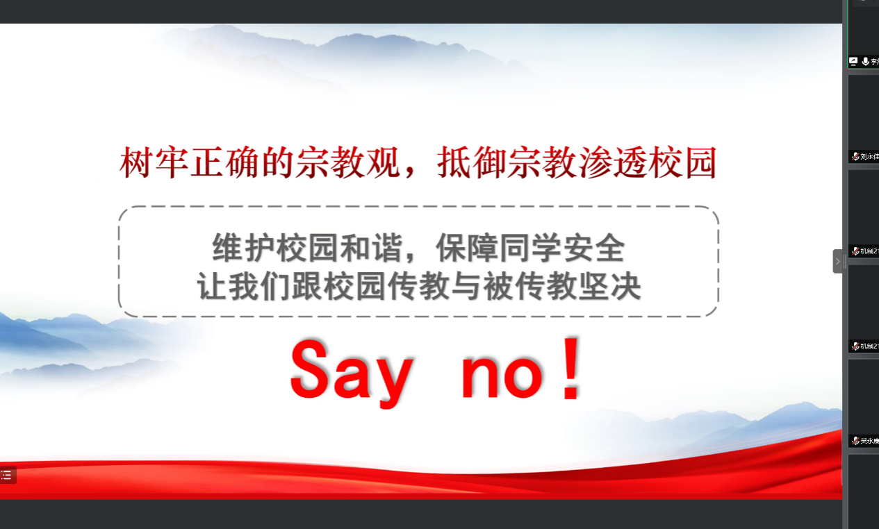 会上,团支书向同学们以“开先河、吹号角、促和谐、促团结”四个词概括介绍了2021年以前的中央民族工作会议,让同学们对国家民族工作有了大致了解,最后提出要铸牢中华民族共同体意识,做铸牢中华民族共同体意识的践行者。团支书表示:“在本次全国宗教工作会议上,对党的宗教工作理论和方针政策作出了新概括,明确提出“九个必须”,积极引导宗教与社会主义社会相适应。”紧接着向同学们介绍了一些宗教相关的政策和法规,引导同学们对校园传教说“不”。