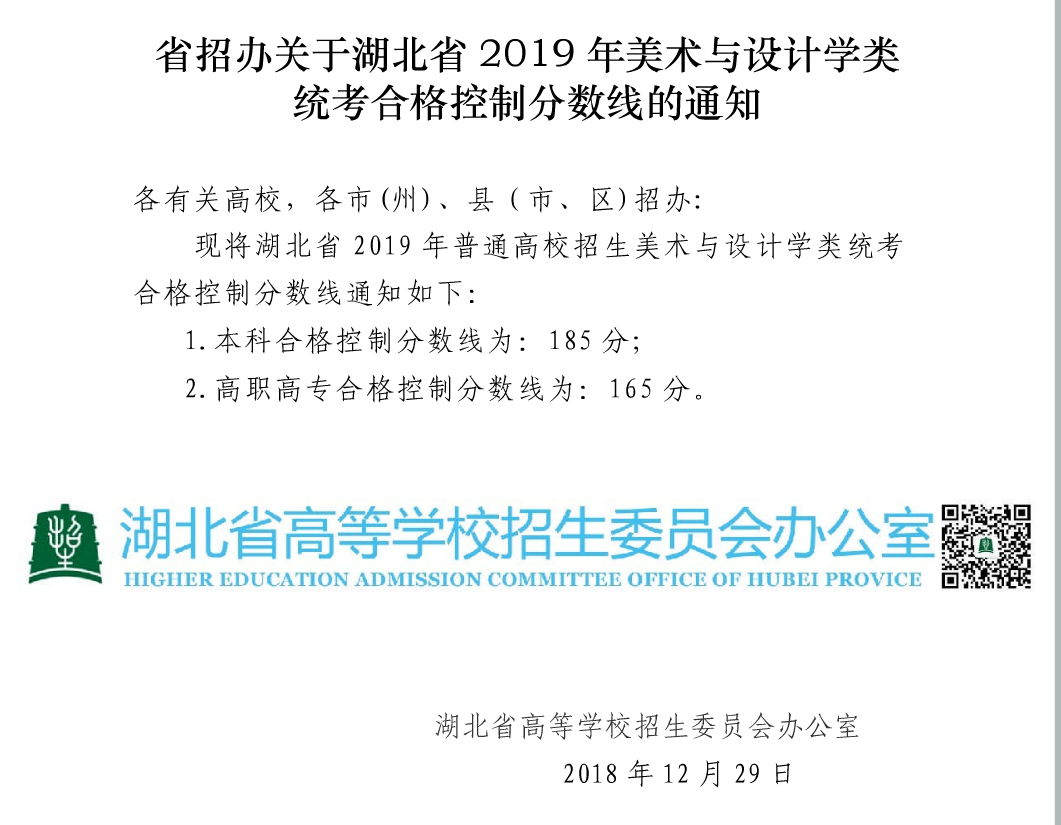 湖北省2019年美术与设计学类统考合格控制分数线