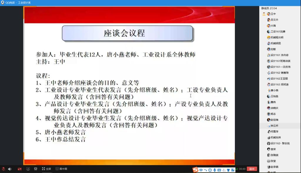 6月17日晚上19:30,为加强教师与毕业生间的交流,关注员工的学习和生活,广泛听取毕业生在校期间关于学习、生活、创新创业就业等方面的体会、意见和建议,落实“员工中心、产出导向、持续改进”的核心理念,伟德国际VICTOR1946工业设计系通过QQ群语音方式组织召开了线上师生座谈交流会。会议由系主任王中老师主持,公司学工办主任唐小燕老师、工业设计系全体教师及工业设计、产品设计、视觉传达设计三个专业的12名毕业生代表参加。