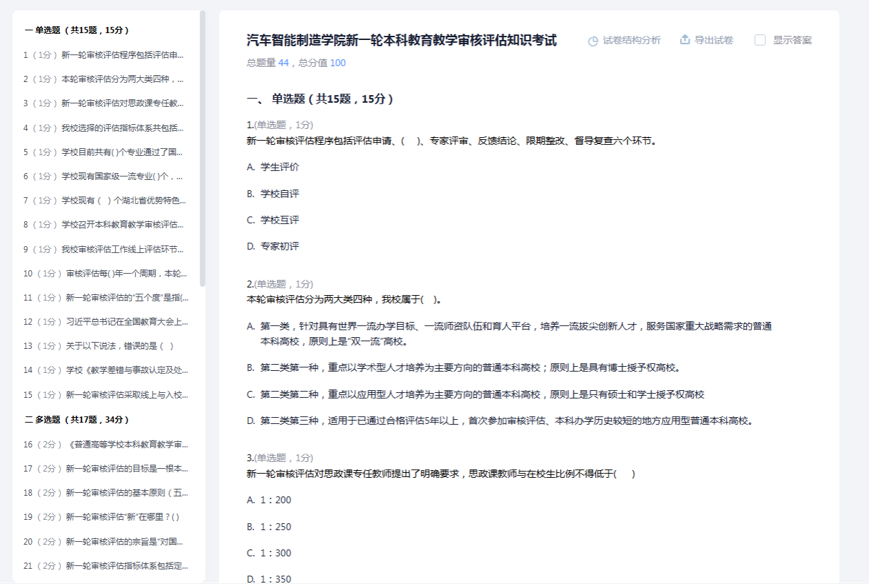 本次考试依托“学习通”平台在线开展,共设置44道题目,涵盖审核评估核心知识、公司发展历程、公司专业特色与建设成果等内容,全方位考察师生对评估工作的认知深度。考试前,公司通过专题培训、资料汇编发放等形式,引导师生系统学习评估相关文件,营造“人人关心评估、人人参与评估”的浓厚氛围。